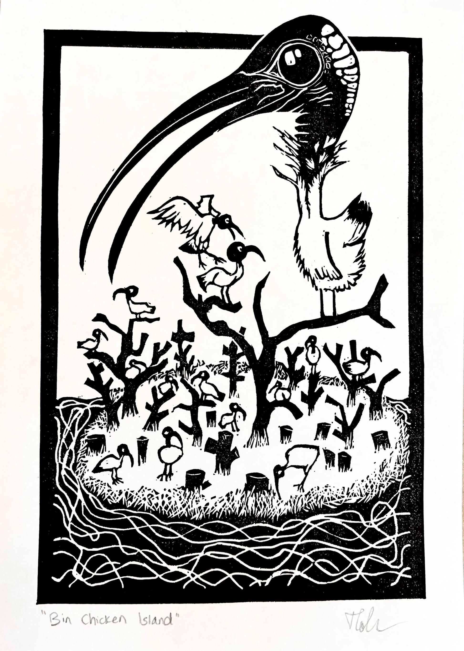 “Bin Chicken Island” Linoprint