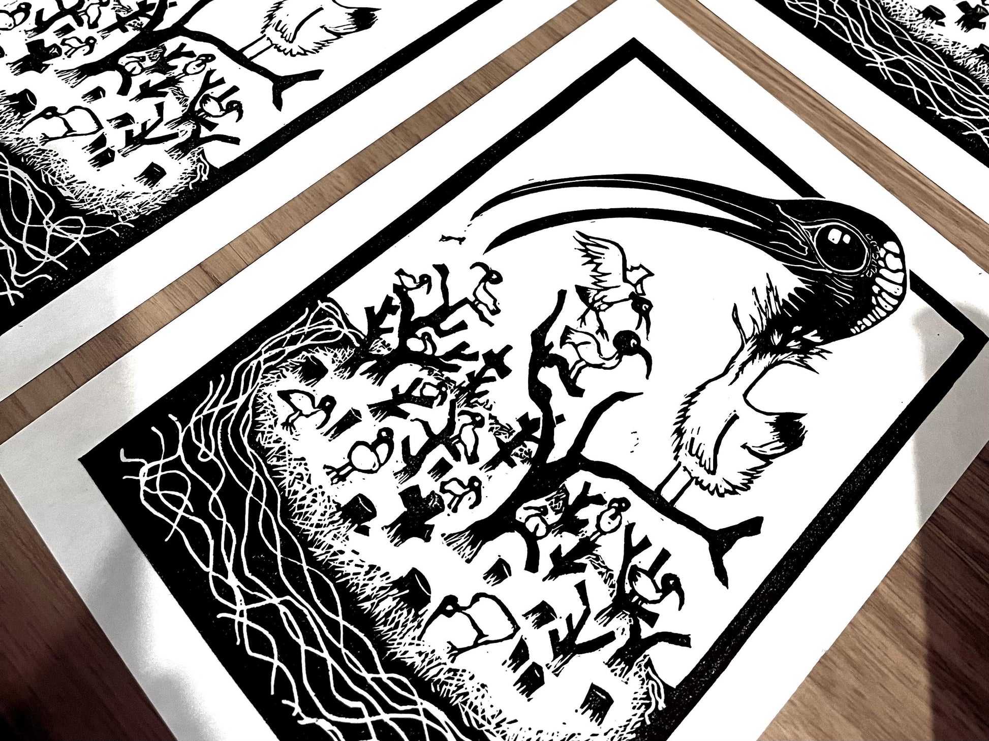 Original linoleum print of an Island inhabited by bin chickens (Ibis).