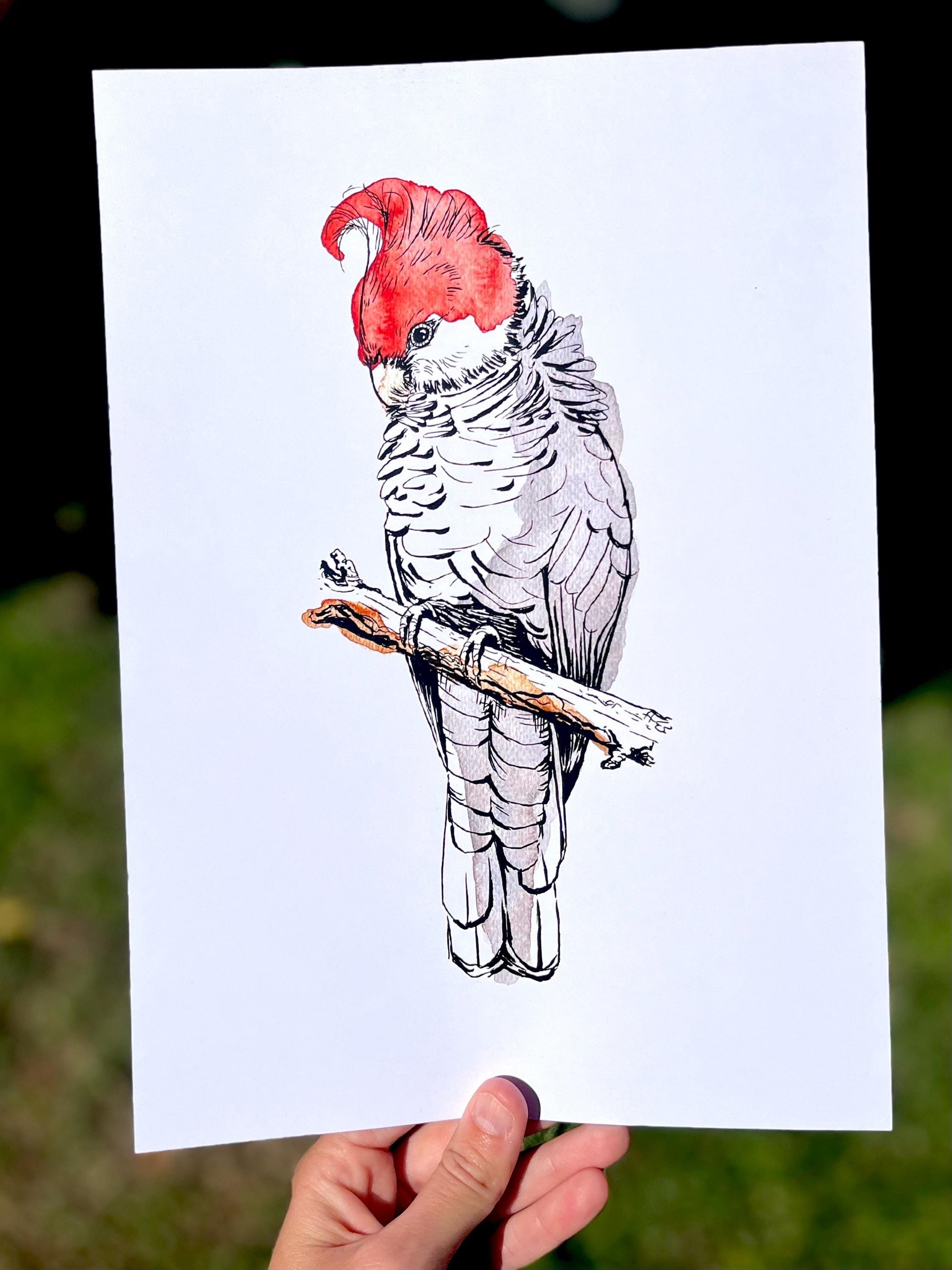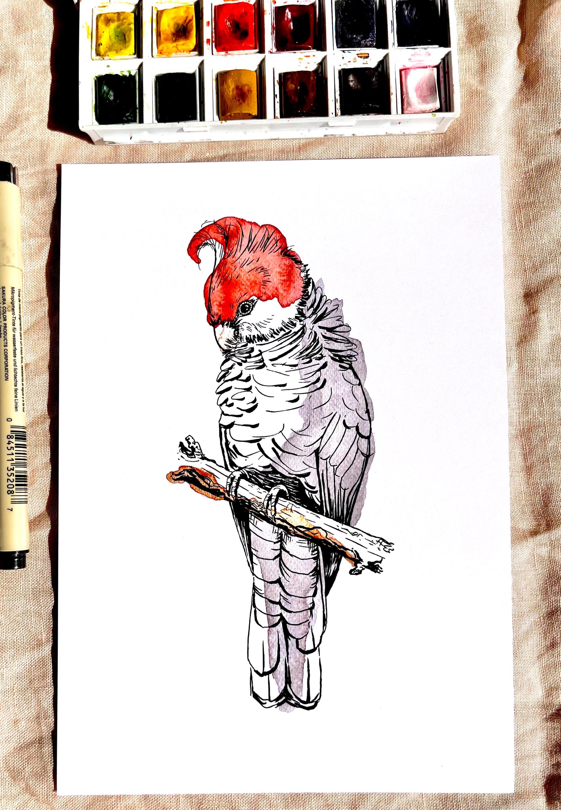 Ink and watercolour artwork of a Gang-gang Cockatoo