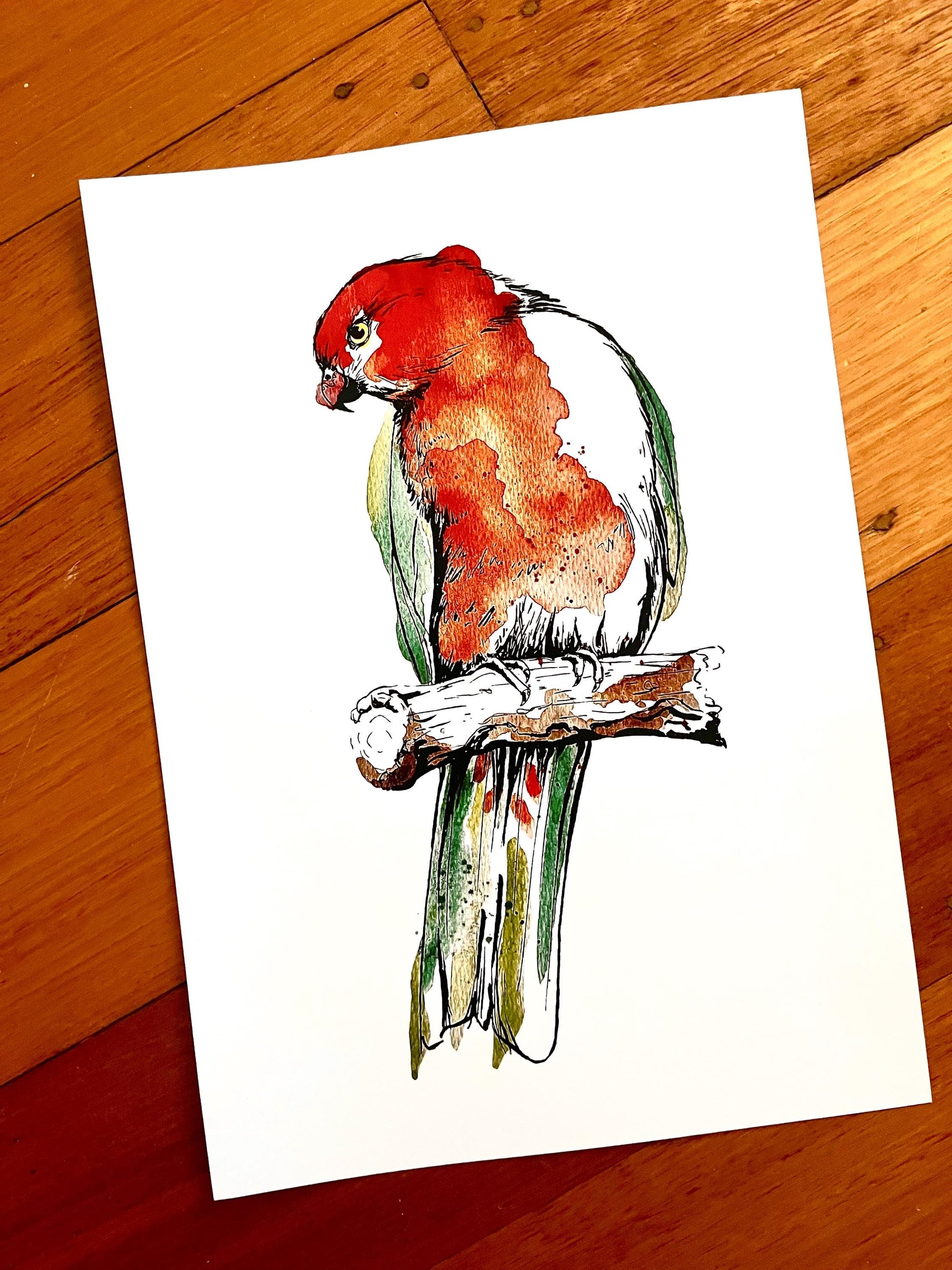 Ink and watercolour artwork of a King Parrot sitting on a branch.